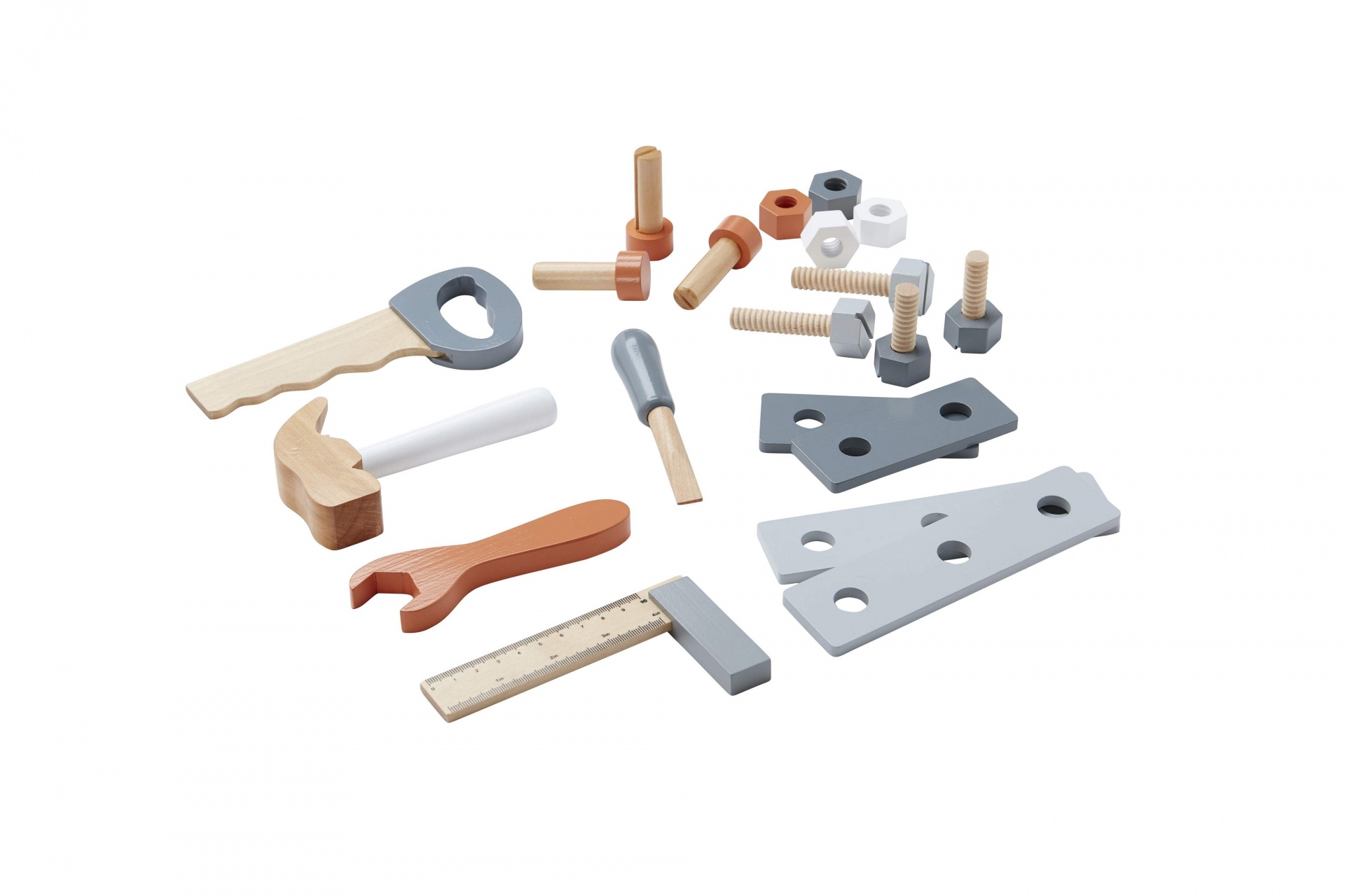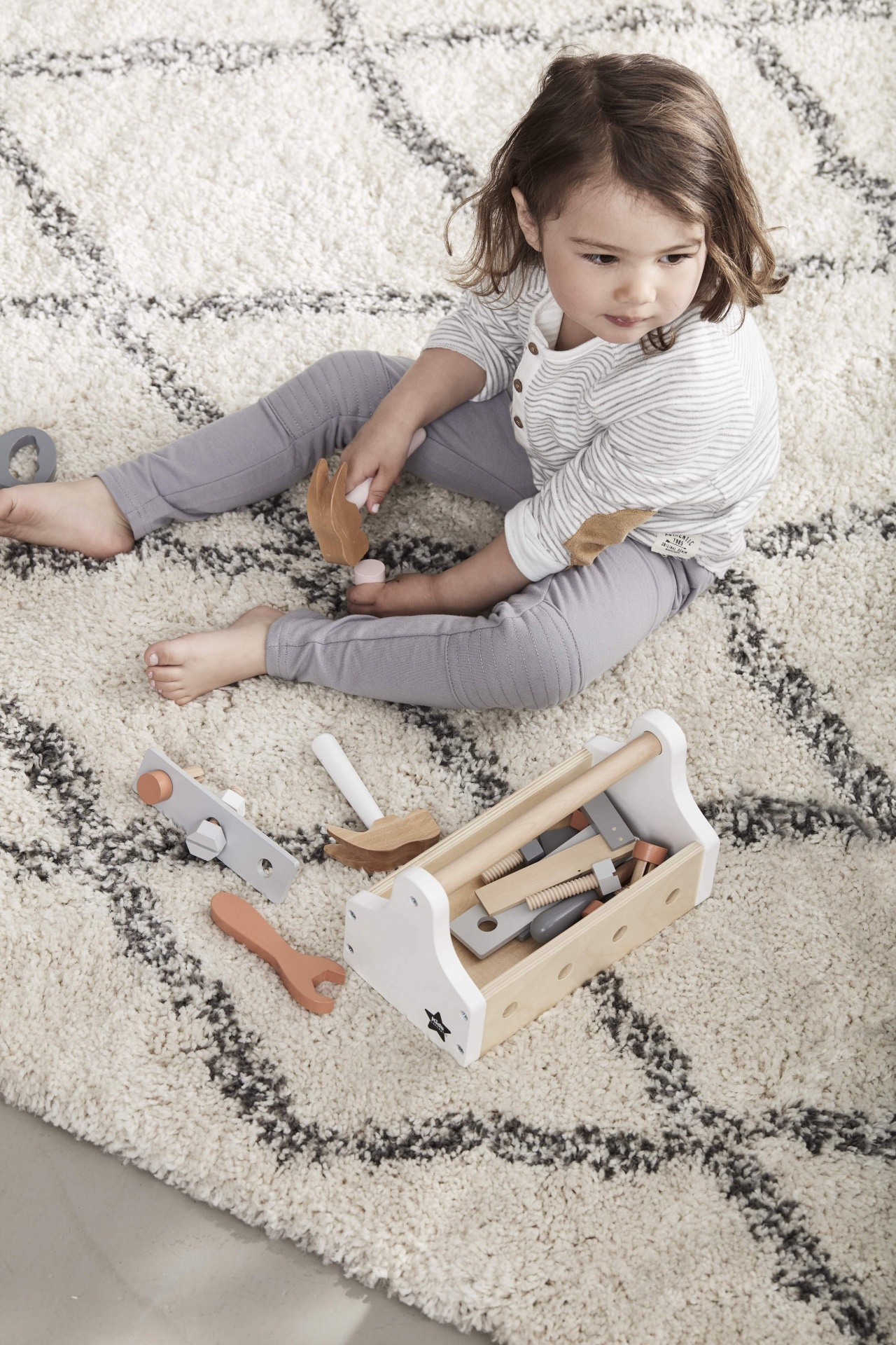 • Criança a brincar com conjunto de ferramentas de madeira num tapete branco com padrão cinzento