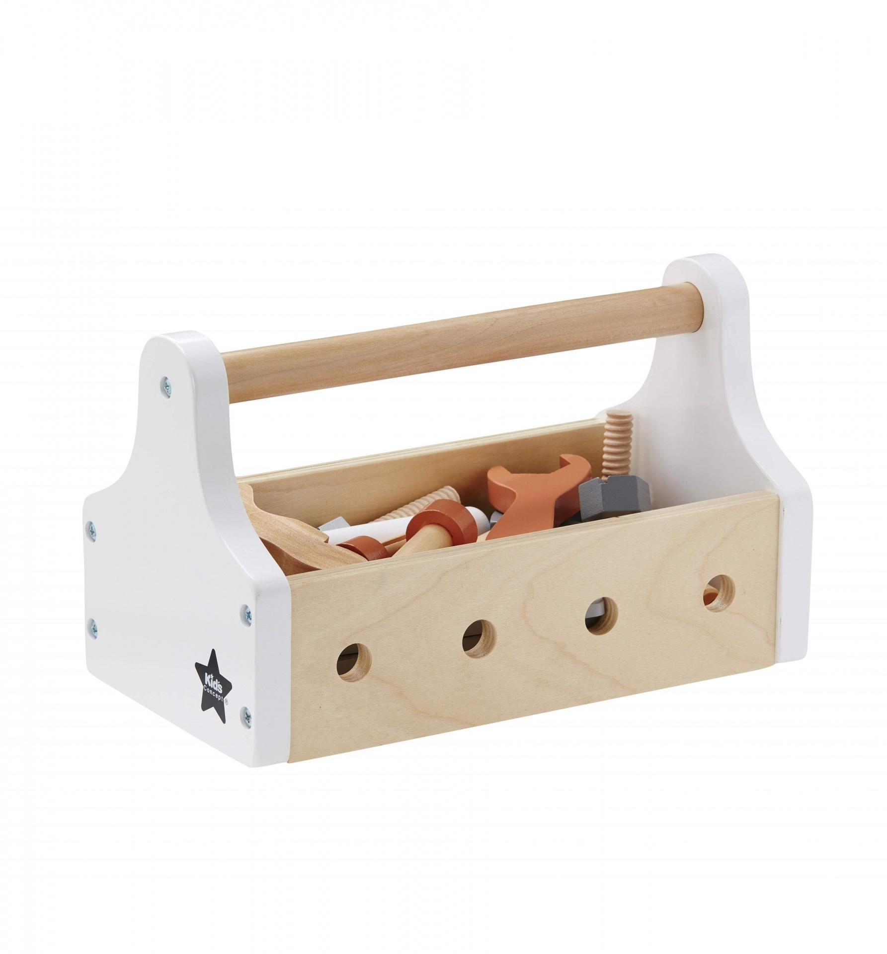 • Caixa de ferramentas de madeira com cabo e ferramentas coloridas