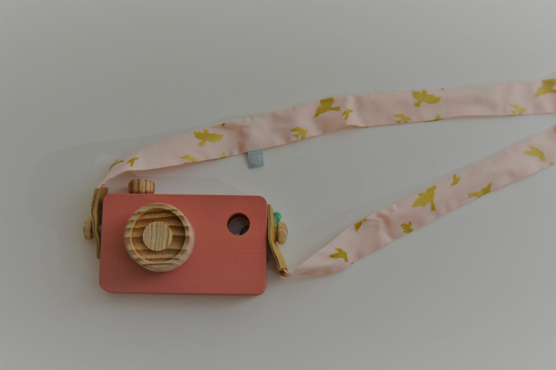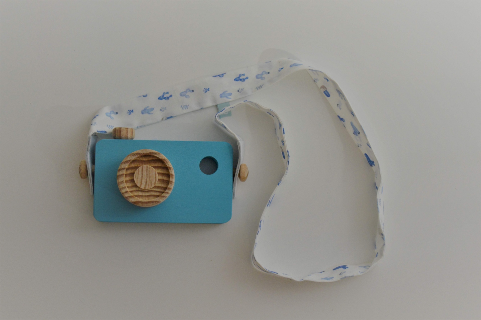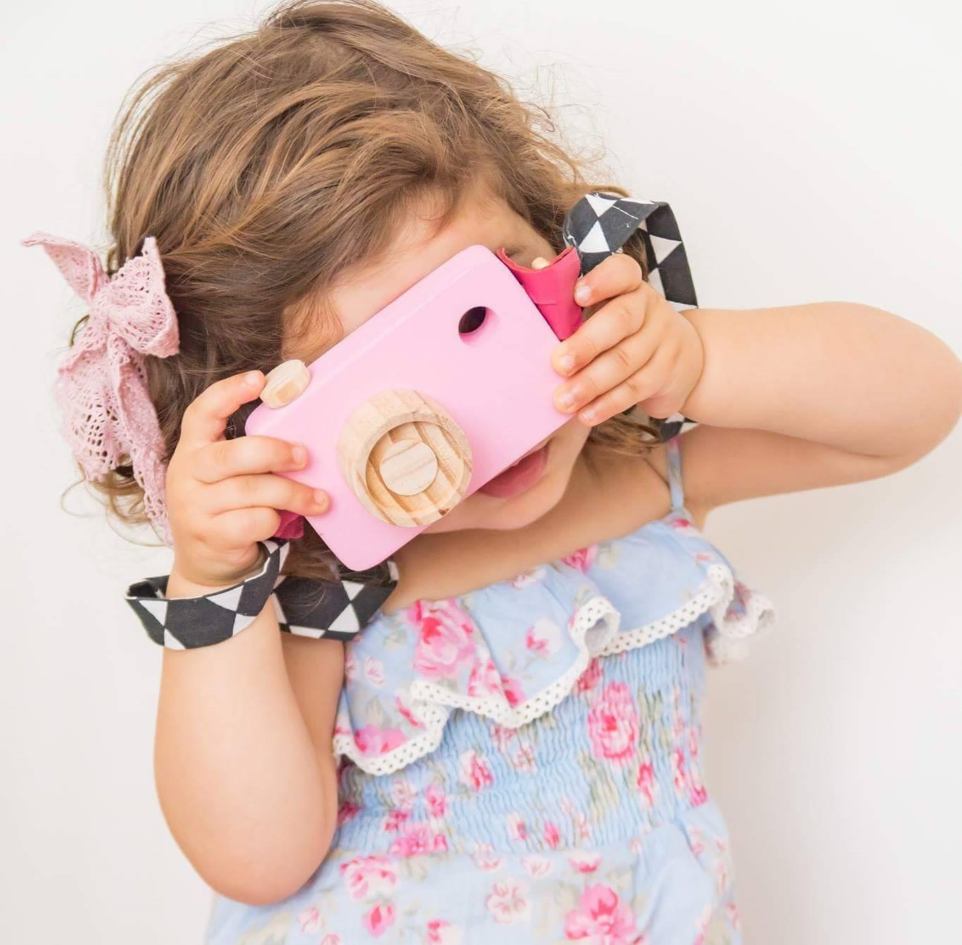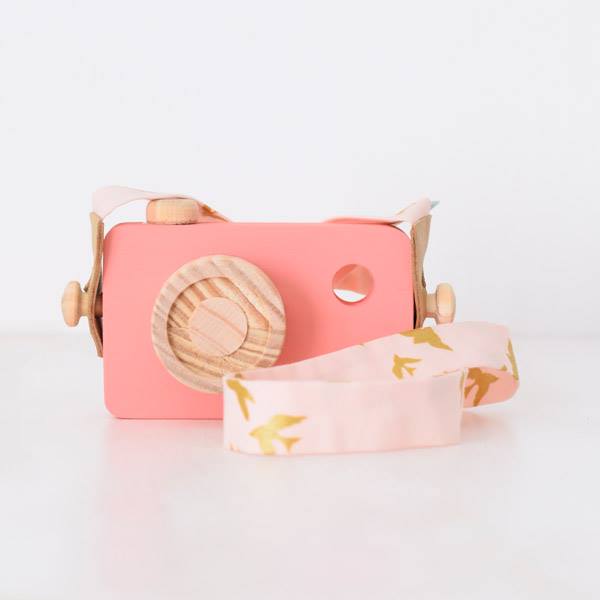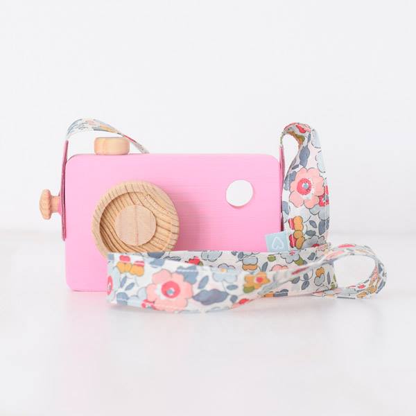 Câmara fotográfica de madeira com correia em tecido. Disponível em azul e em dois tons de rosa.