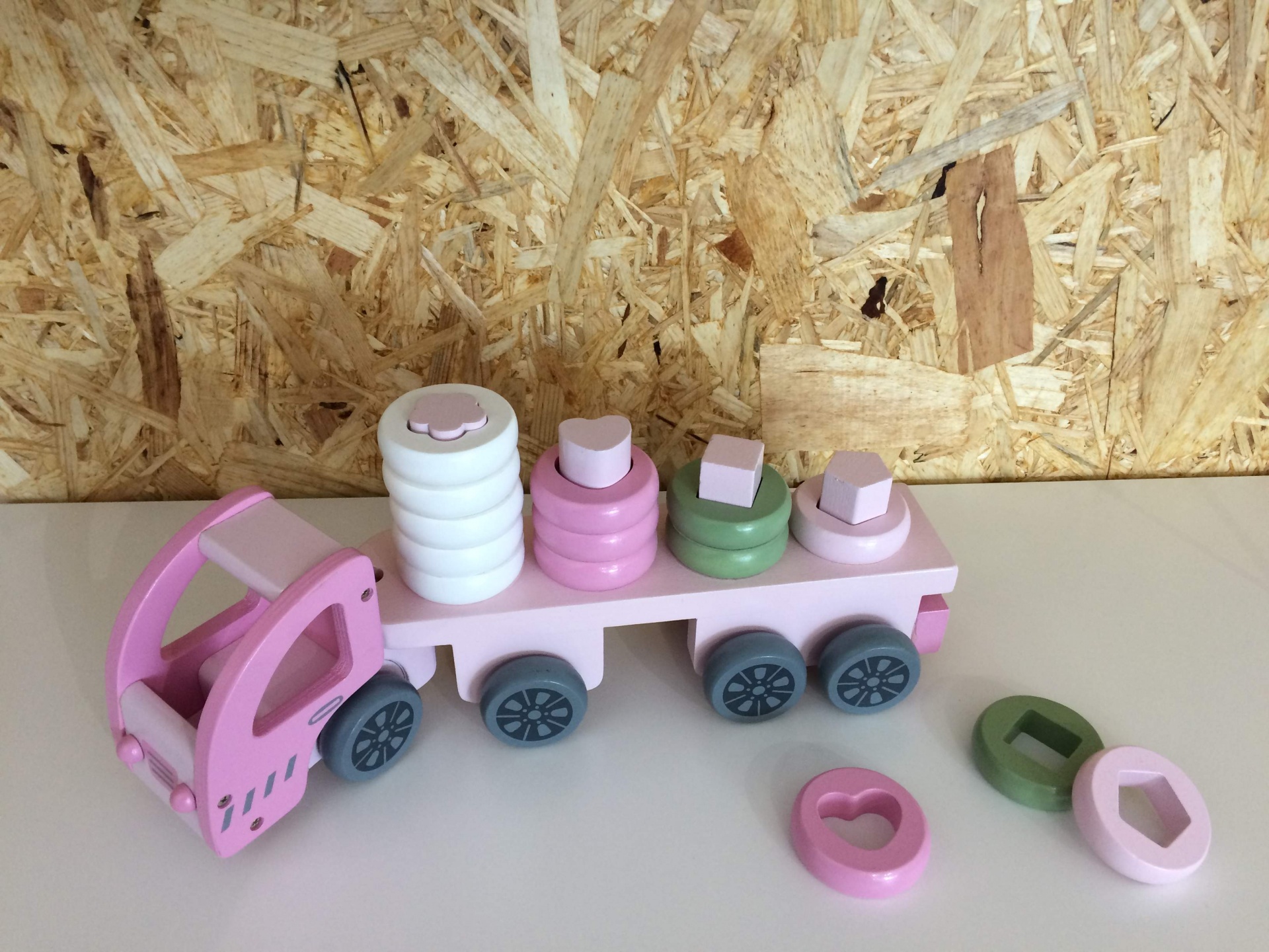 • Brinquedo de madeira rosa em forma de camião com formas geométricas empilhadas.