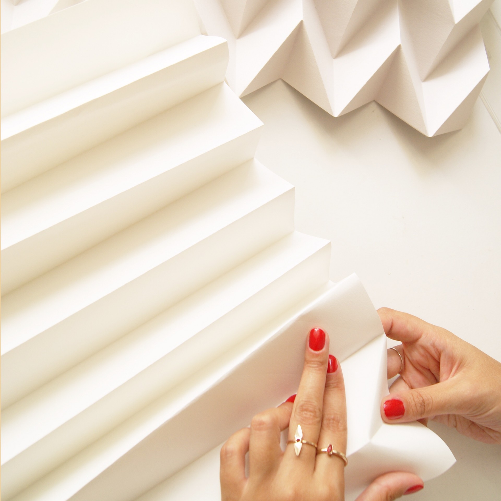 Candeeiro de teto liso azul feito à mão em origami, com papel de alta qualidade. Também disponível em rosa e em branco com barra amarela.