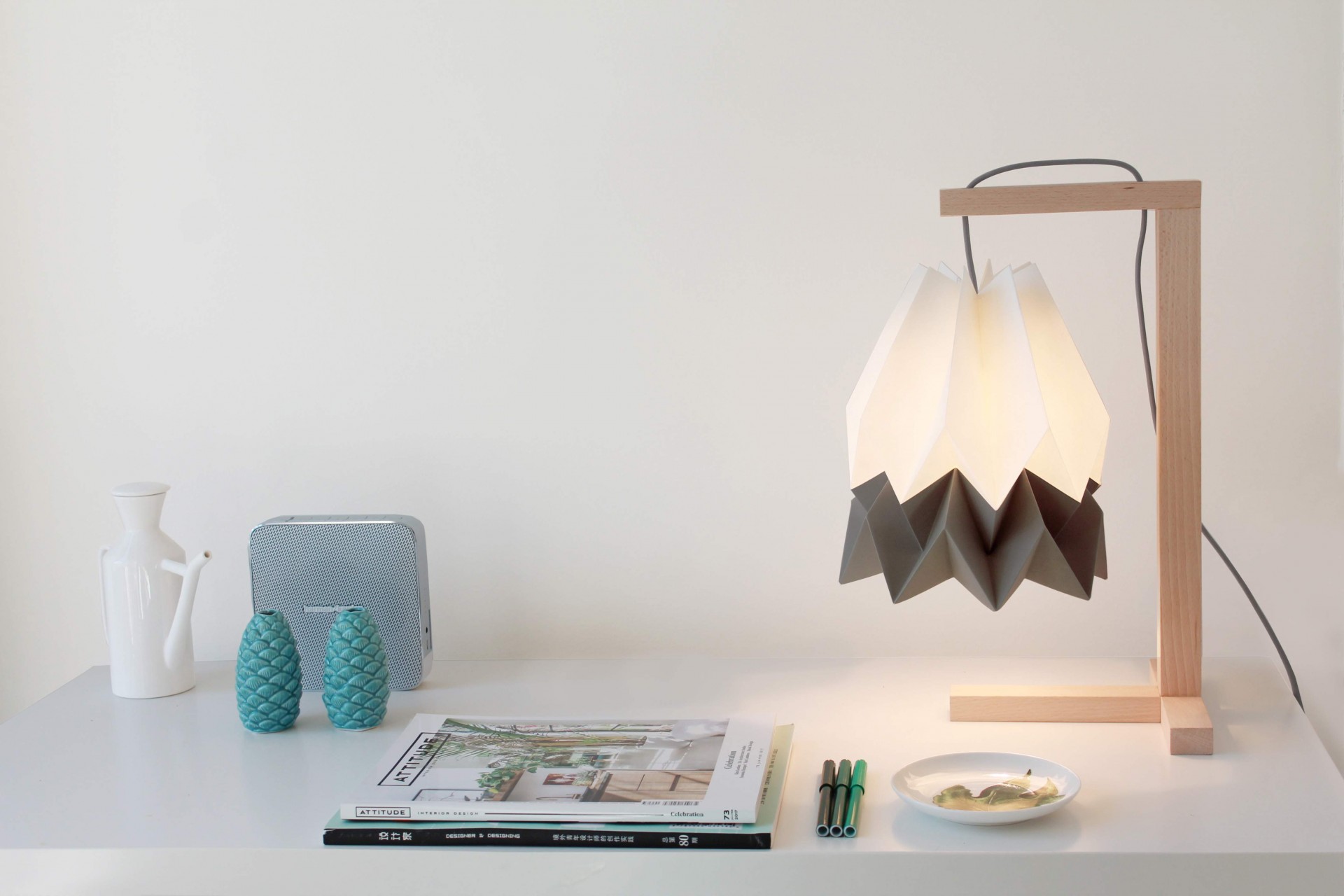 • Mesa branca com objetos decorativos e candeeiro moderno de madeira com abajur de papel