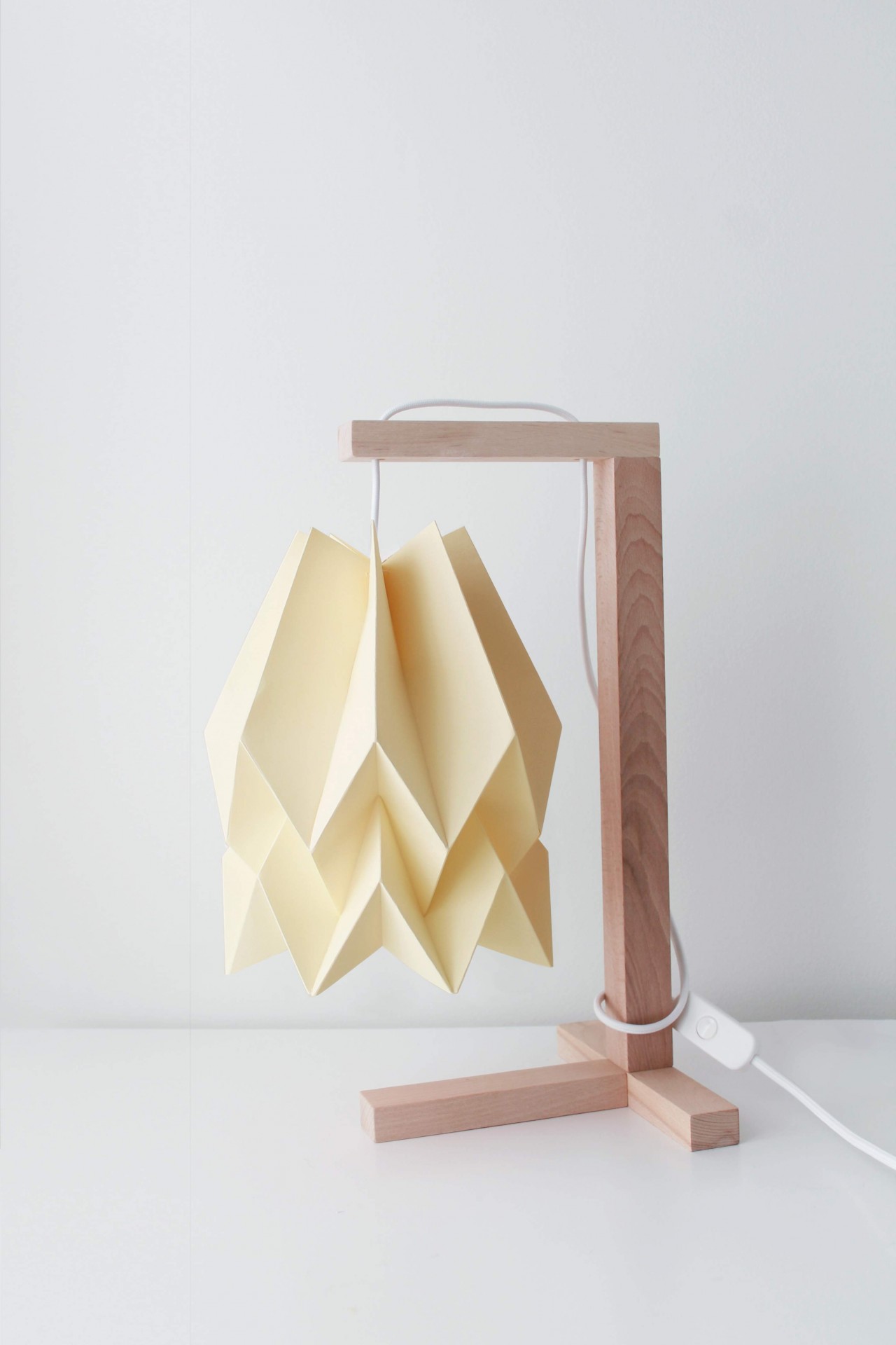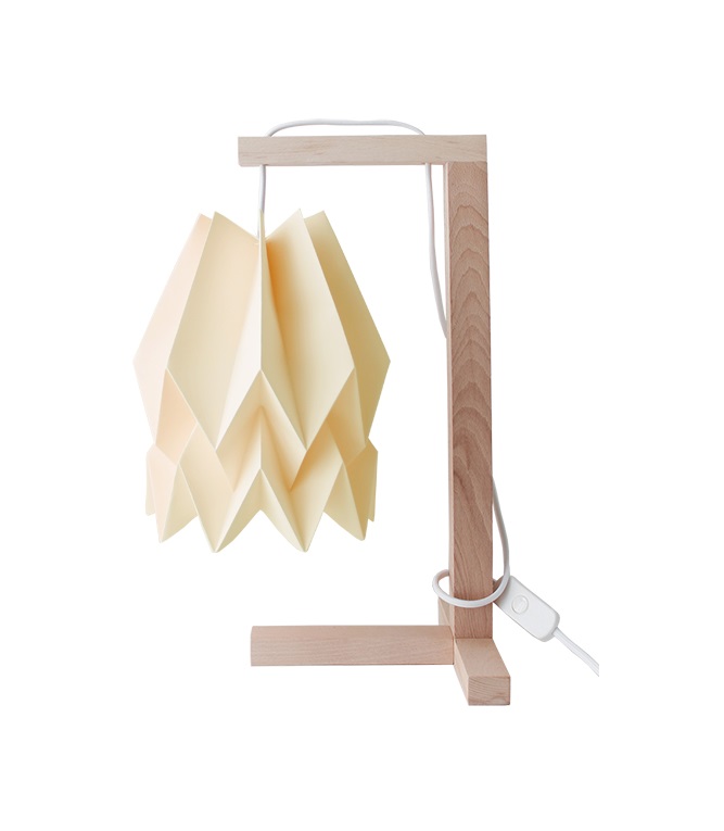 • Candeeiro de mesa com estrutura de madeira clara e abajur de papel creme dobrado