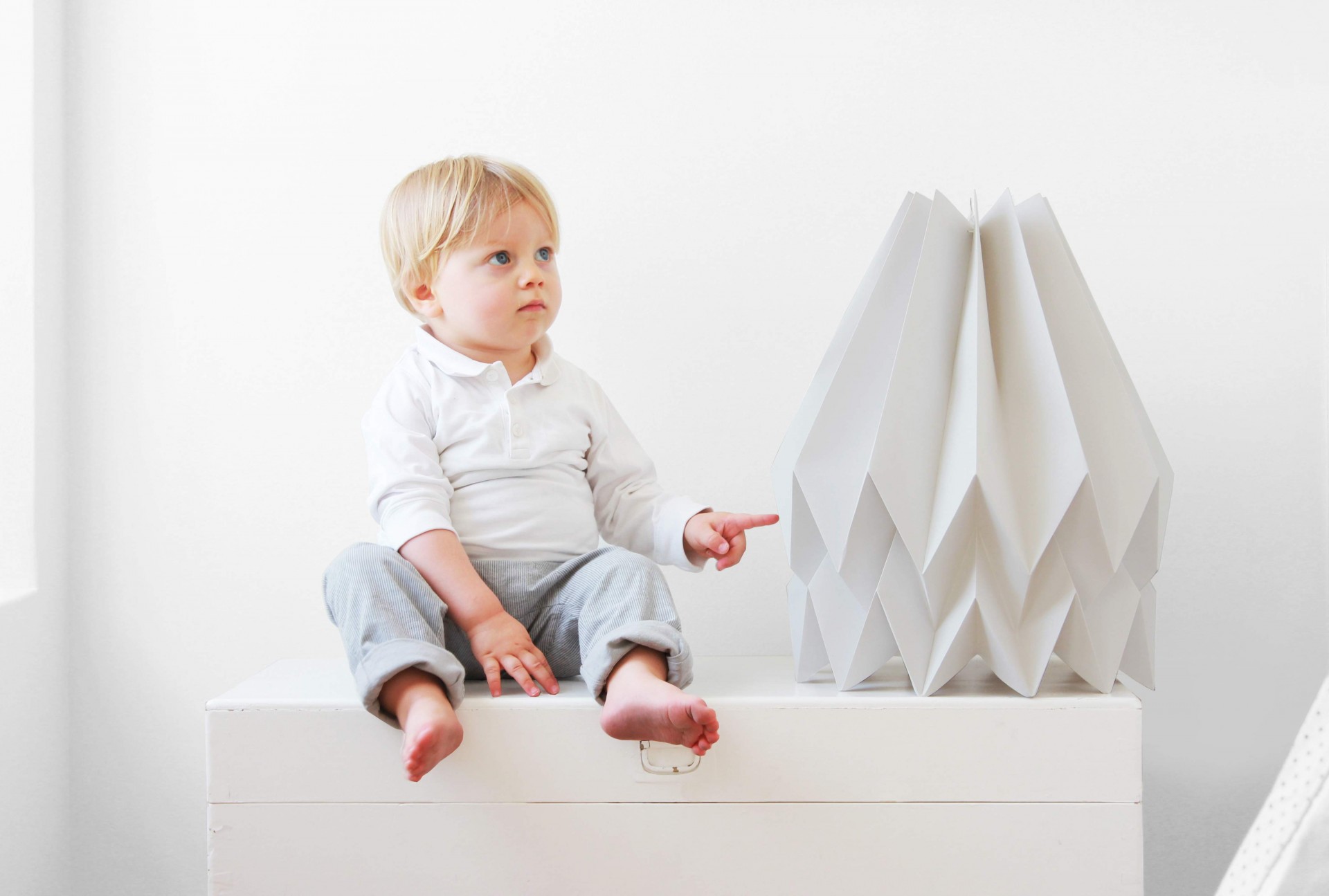 • Menino pequeno sentado ao lado de objeto decorativo branco em superfície branca
