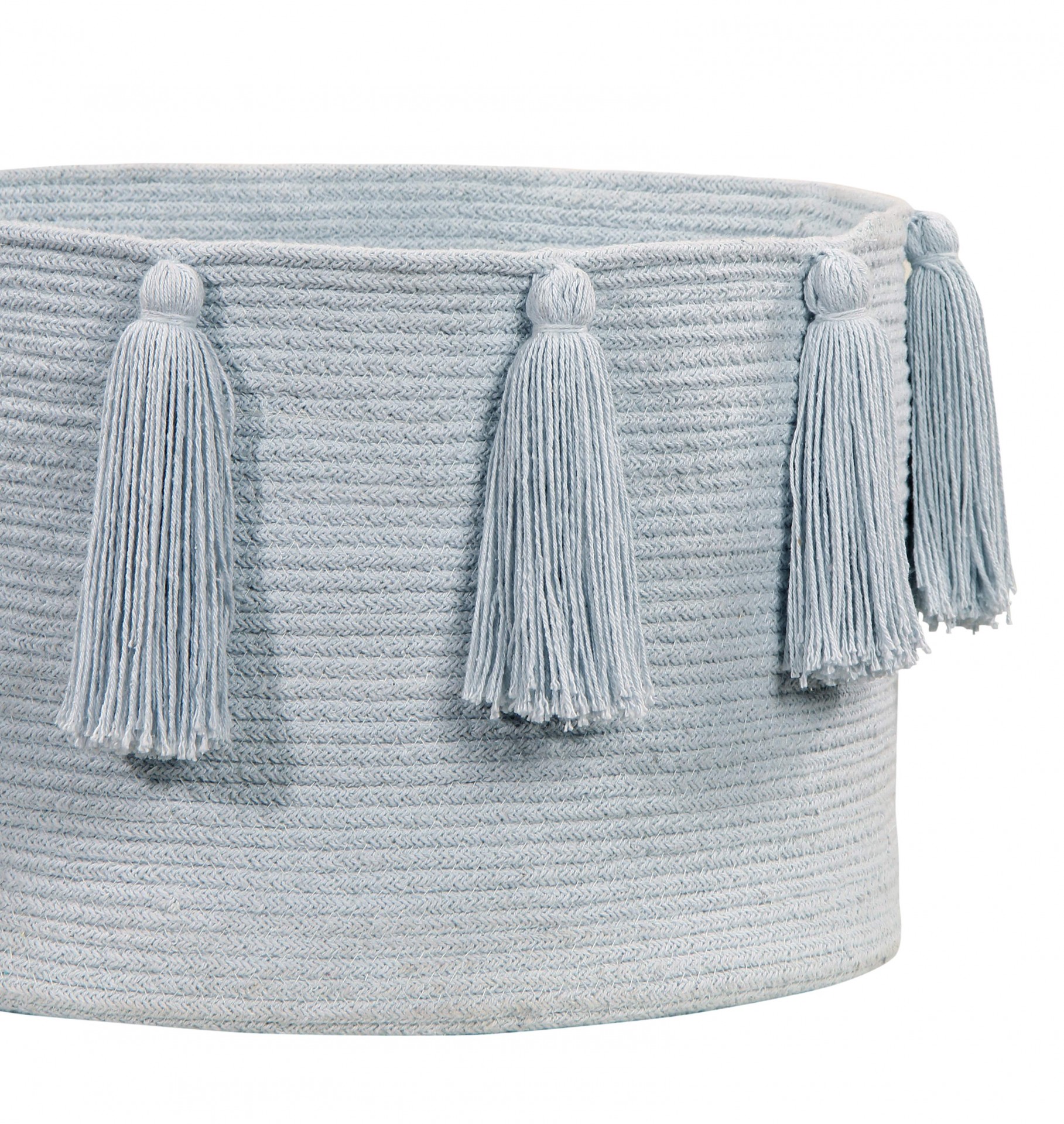 Cesto 100% algodão na cor azul suave decorado com borlas da mesma cor a toda a volta.