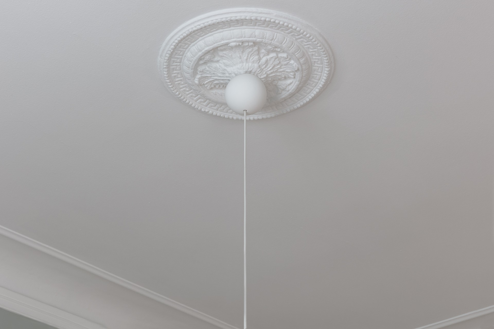 • Tecto branco com rosa de gesso decorativa e candeeiro pendurado branco