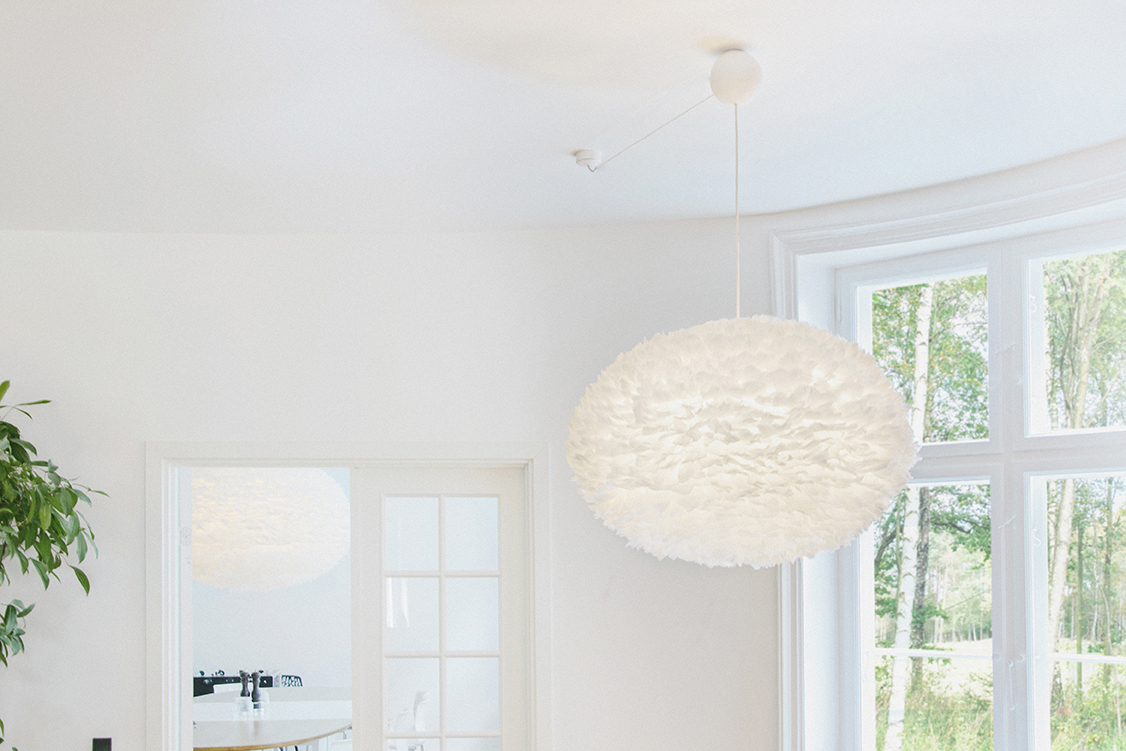 • Lustre branco pendente com textura de penas num interior branco com janelas e porta de vidro