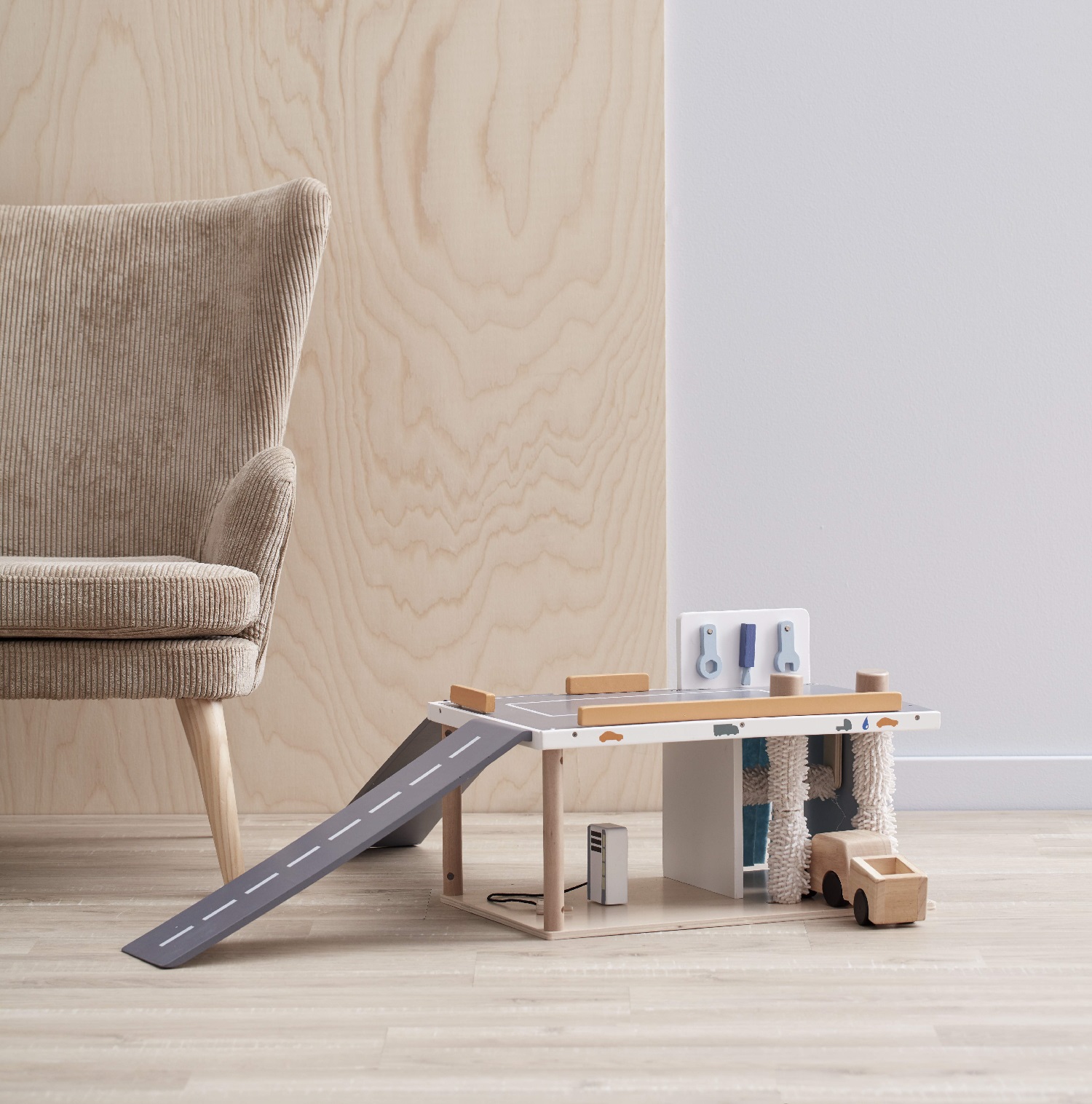 Estação de serviço em madeira com bomba de combustível, lavagem de carros e duas rampas de acesso à área de oficina. Inclui três ferramentas de brincar em madeira e os rolos da lavagem de carros movem-se, para uma ação mais realista. Carros não incluídos.