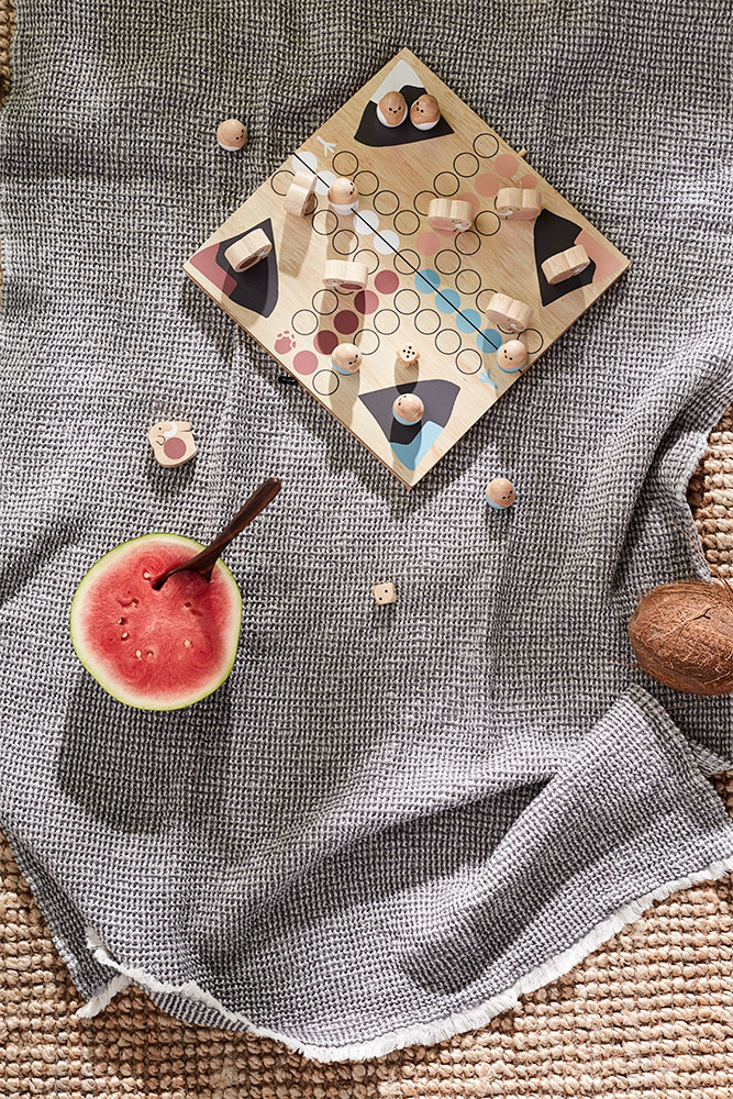 • Jogo de tabuleiro de madeira com peças, manta cinza e melancia com coco ao lado