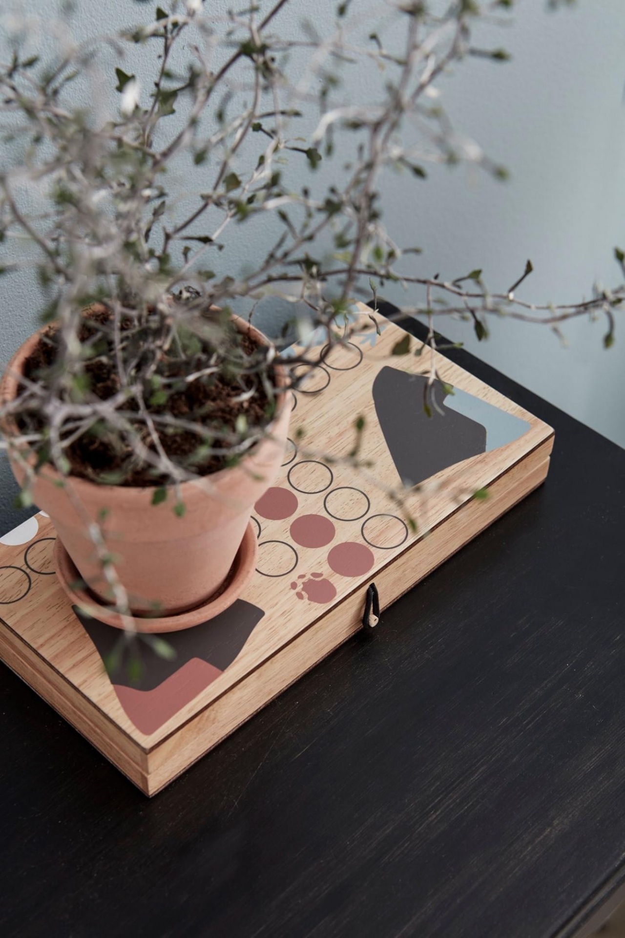 O tabuleiro fechado permite guardar as peças de jogo no seu interior. Aberto ou fechado, este jogo é também um bonito elemento para decoração, graças ao seu aspeto natural.