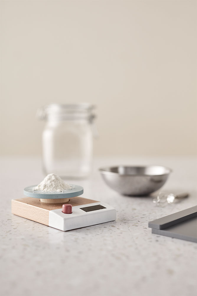 • Balança de cozinha digital com farinha e utensílios em bancada branca