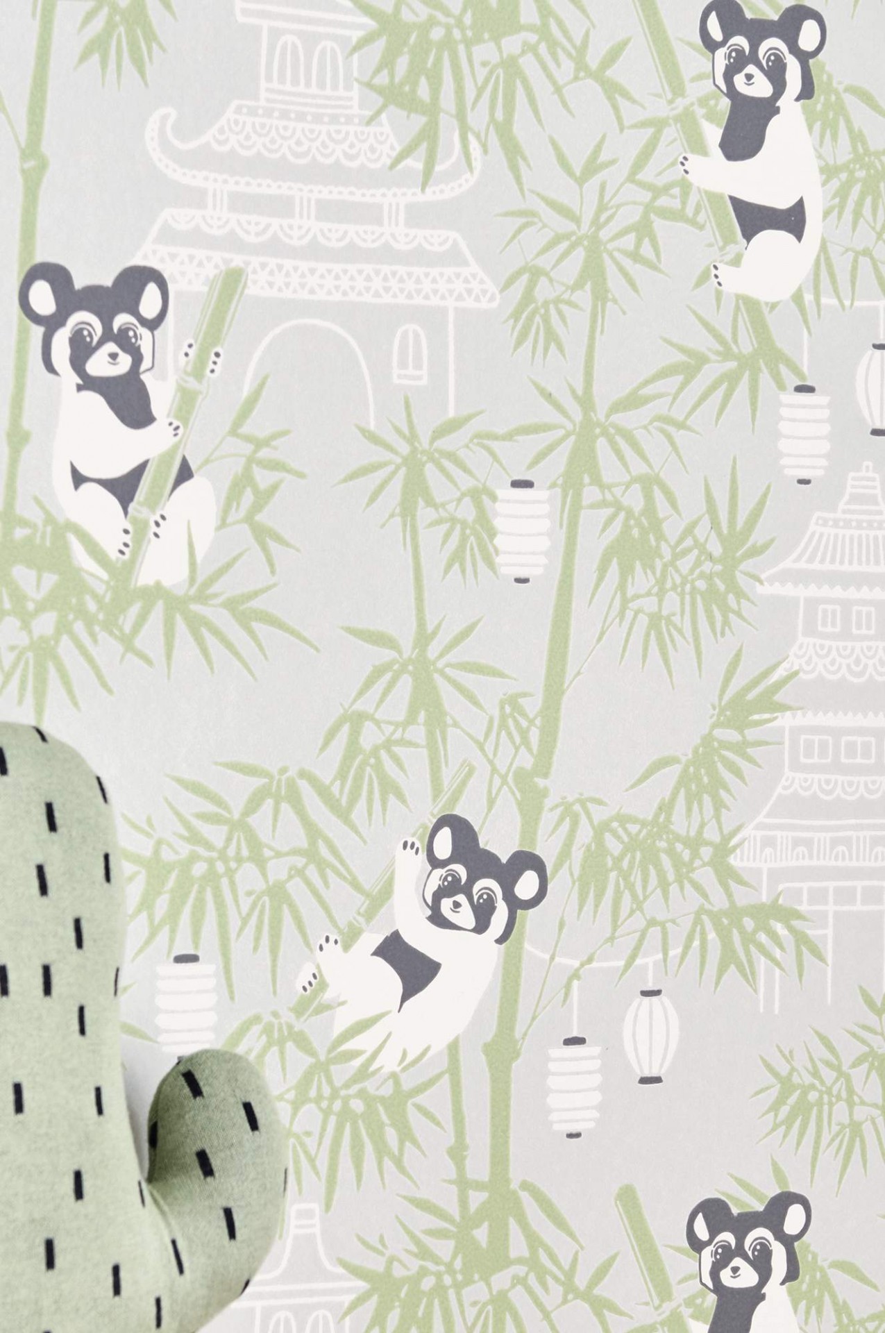 • Papel de parede com padrão de bambus verdes, lanternas brancas e ursos a escalar