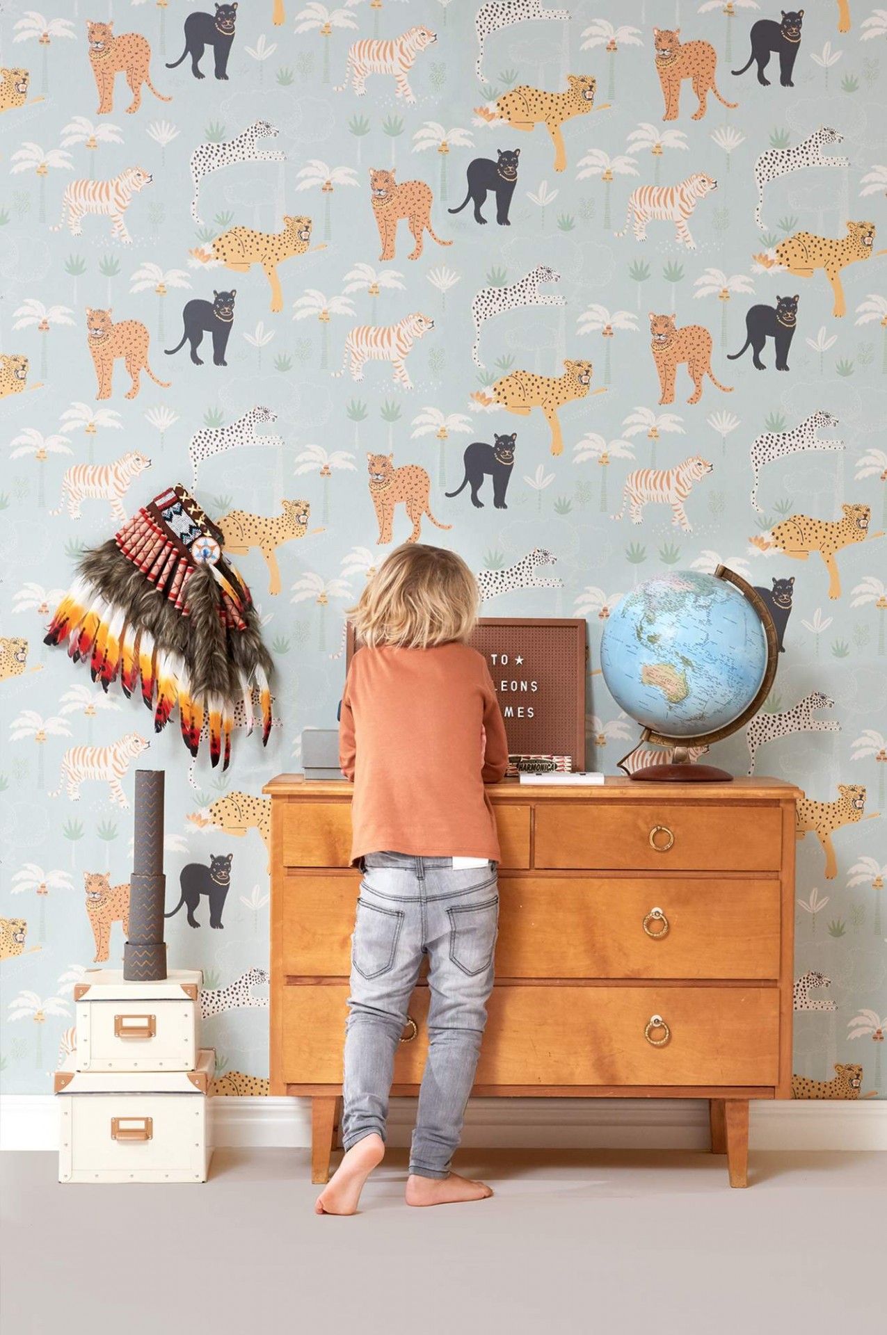 Papel de parede com animais da selva, de entre os quais se destaca a pantera, que dá o nome a este bonito papel. Perfeito para criar um incrível destaque na decoração! Disponível em três variações de cor.