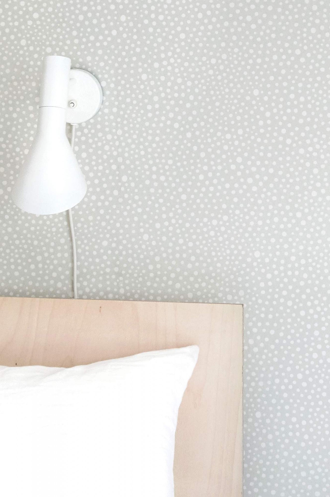 Bonito papel de parede, com as suas pintas brancas num design que fica tão bem em quartos de criança como em salas ou quartos de adultos!