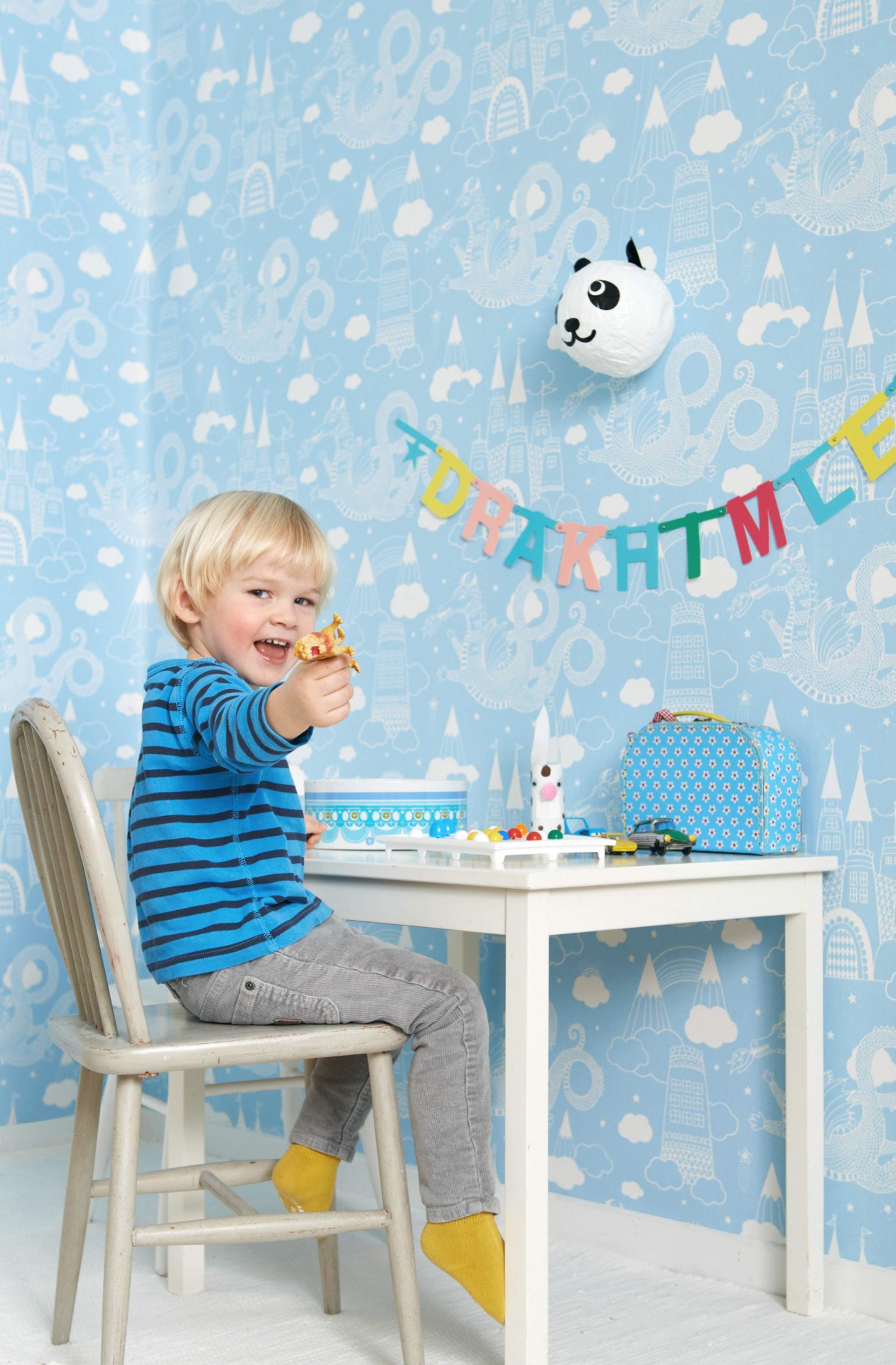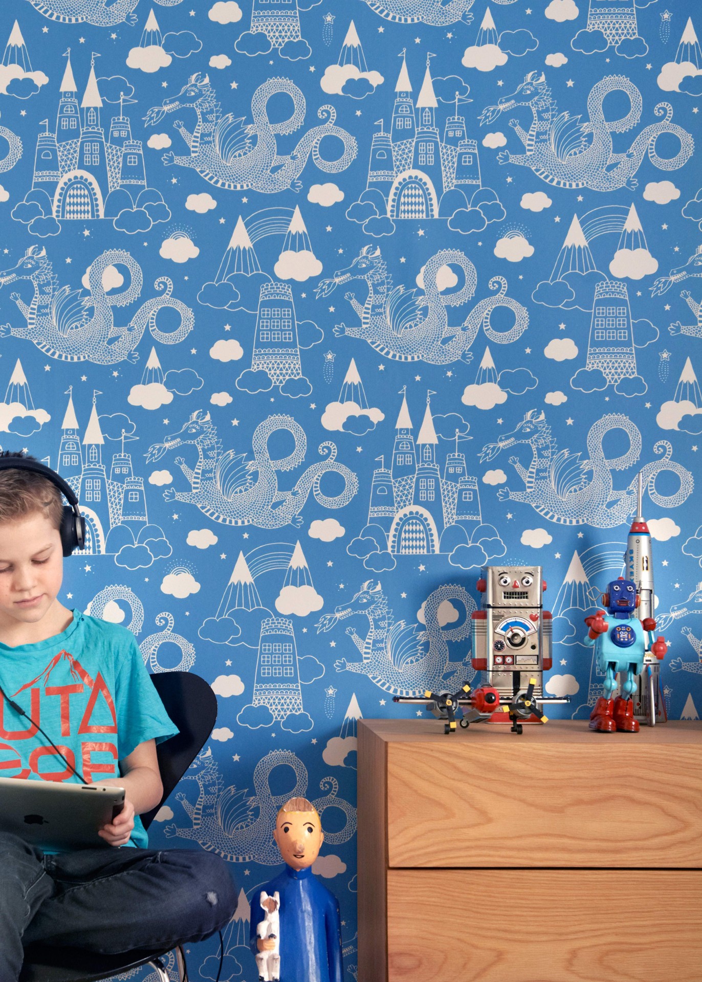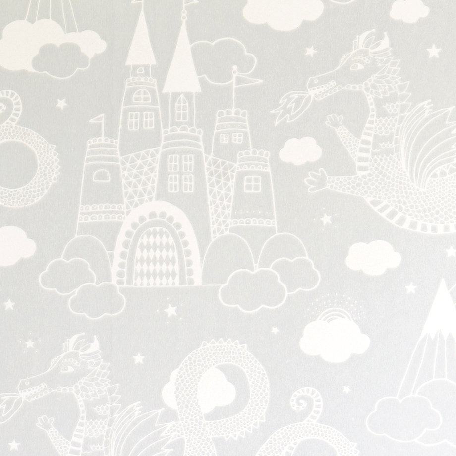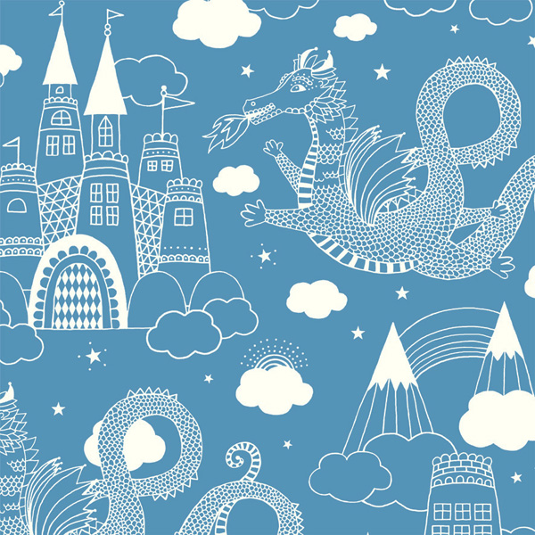 Bonito papel de parede, com os seus dragões e castelos, perfeito para quem adora grandes aventuras! Disponível em três variações de cor.