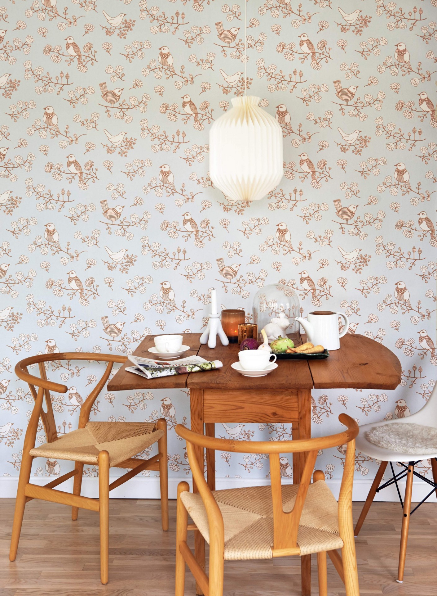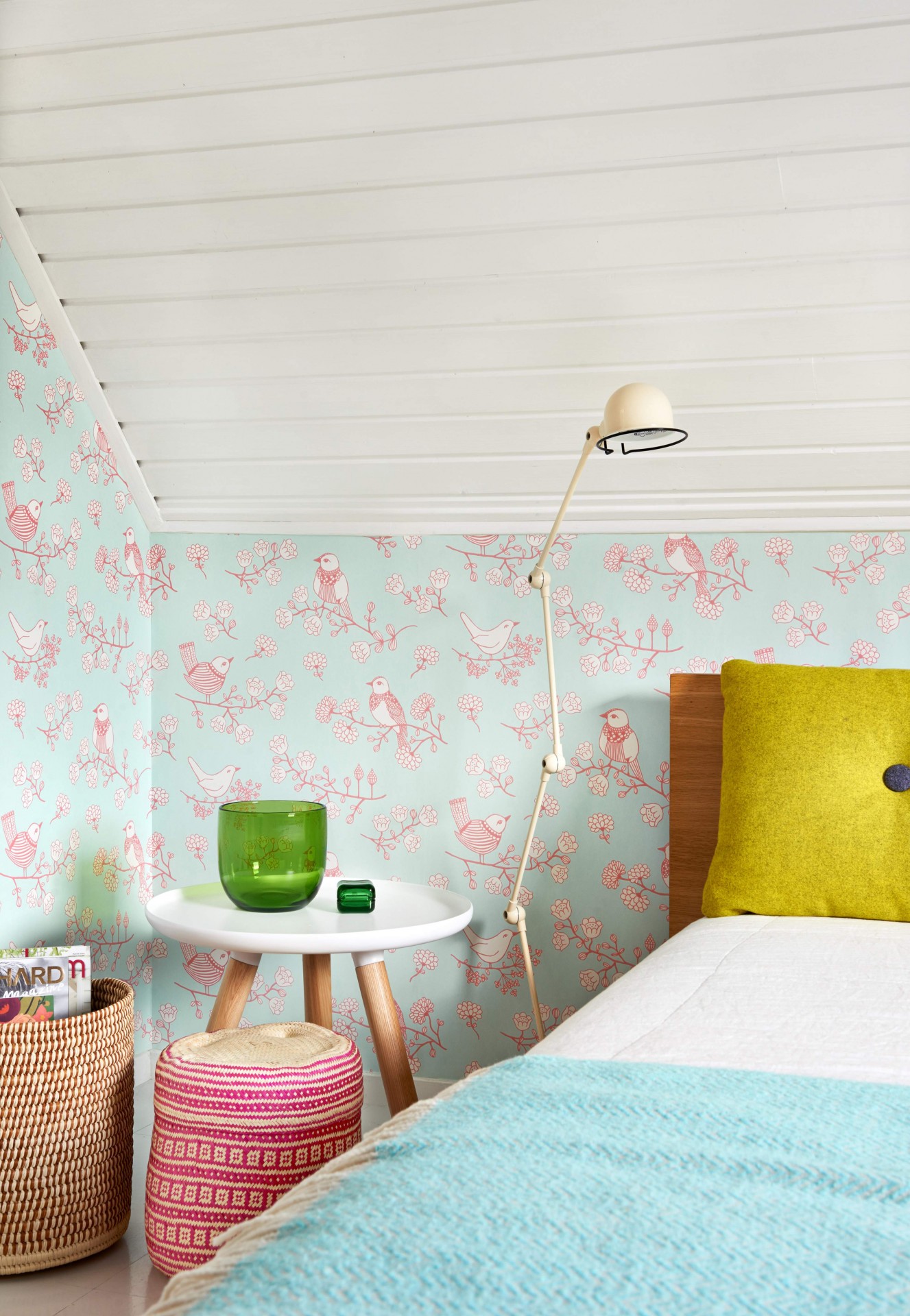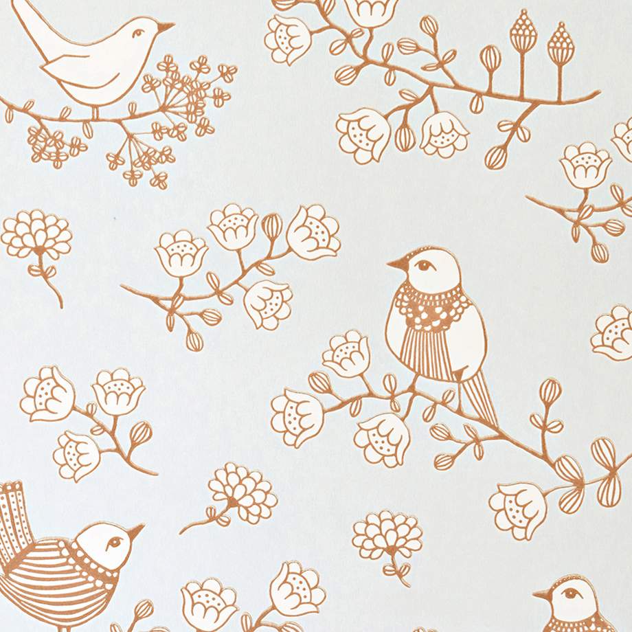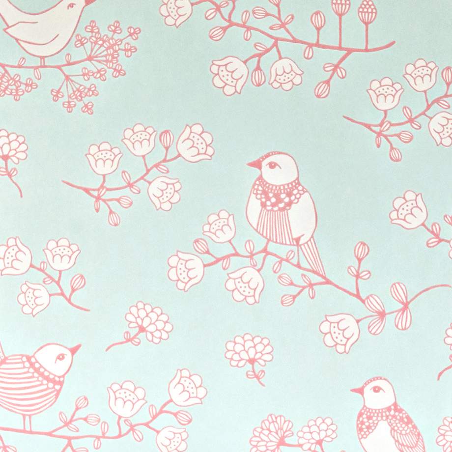 Bonito papel de parede com passarinhos e ramos de árvores com flores. Um design delicado que fica tão bem em quartos de criança como em outras divisões da casa! Disponível em duas variações de cor.