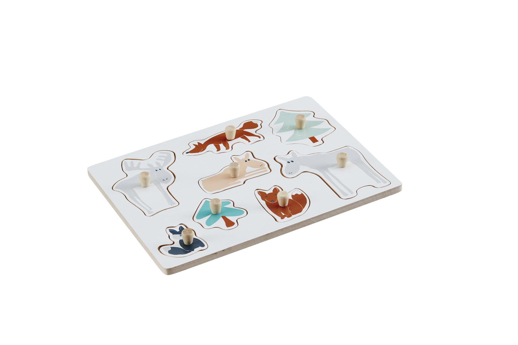 Tabuleiro de madeira com 8 formas recortadas em baixo relevo para encaixar as respetivas peças de madeira (árvores e animais da floresta). Um brinquedo simples e bonito que ajuda a estimular na criança a motricidade e o reconhecimento de formas e figuras.
