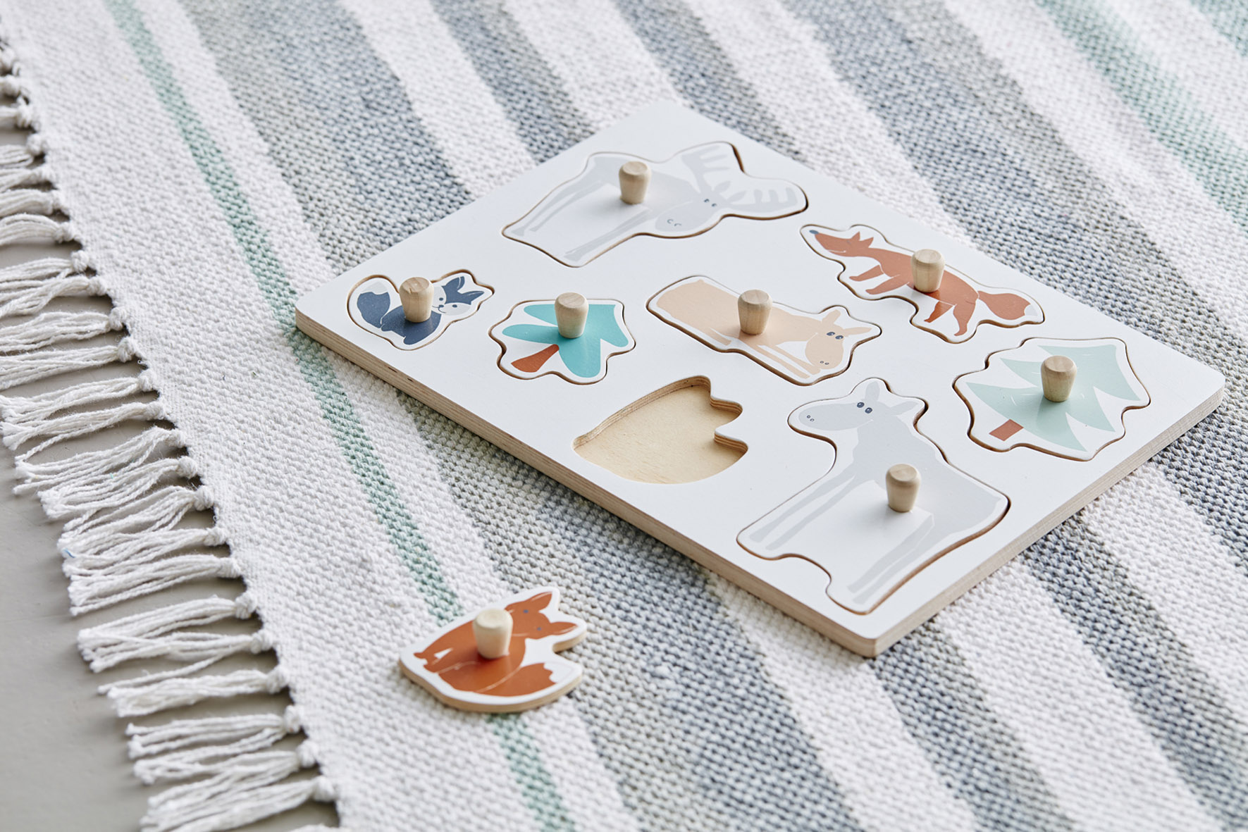 • Quebra-cabeça de madeira com formas de animais sobre tapete listrado cinza e branco