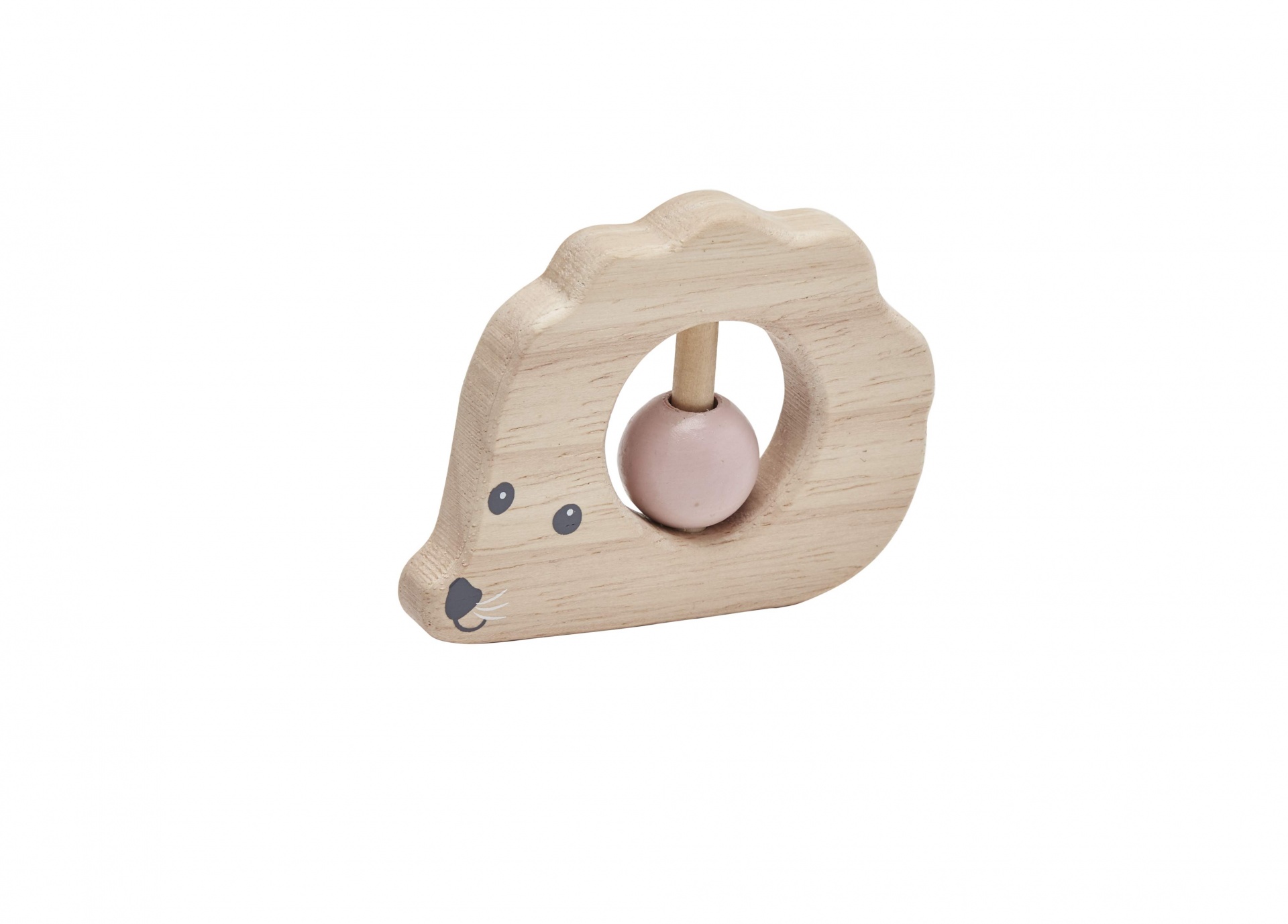 Chocalho de madeira em forma de ouriço com uma conta cor-de-rosa