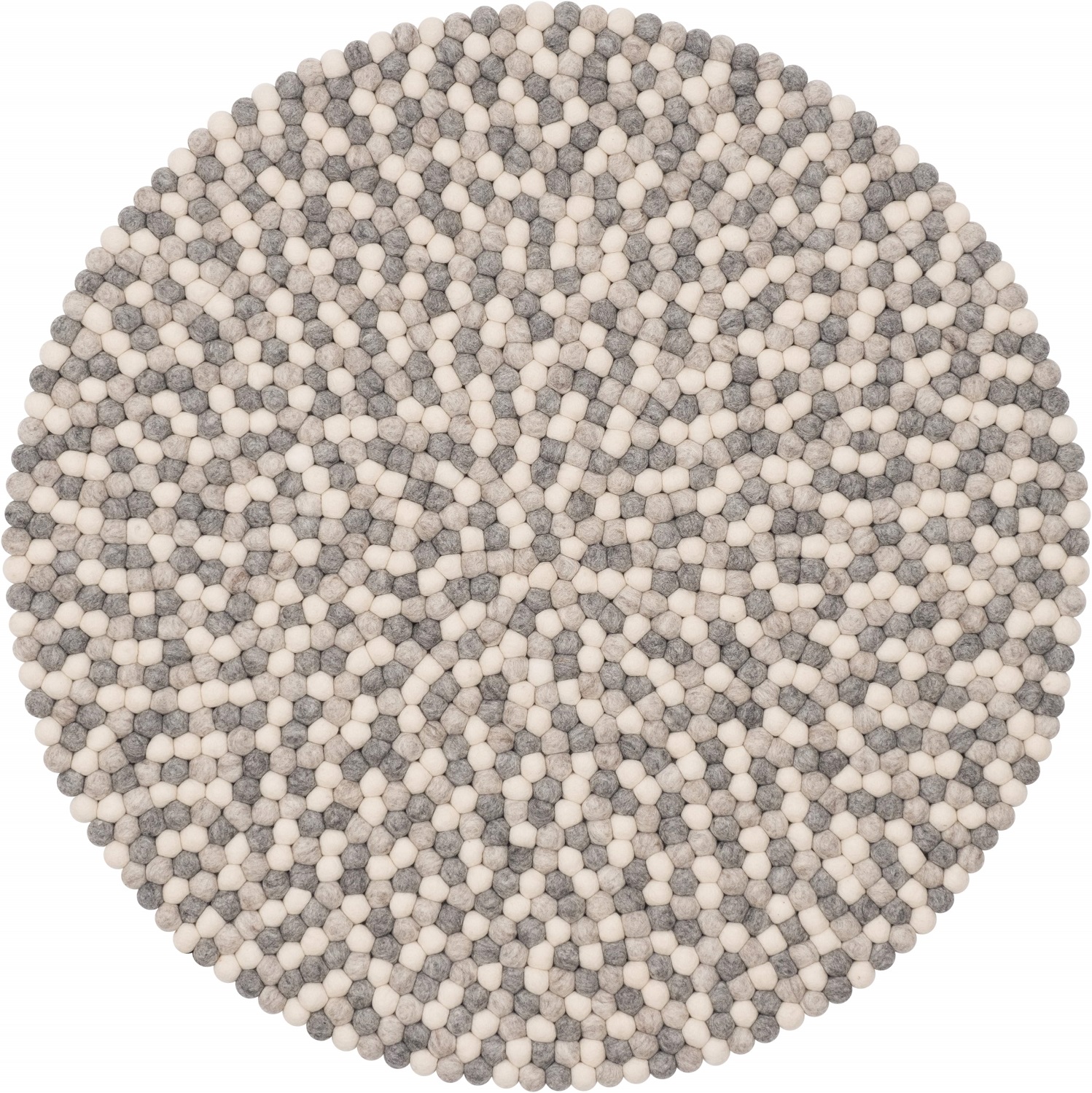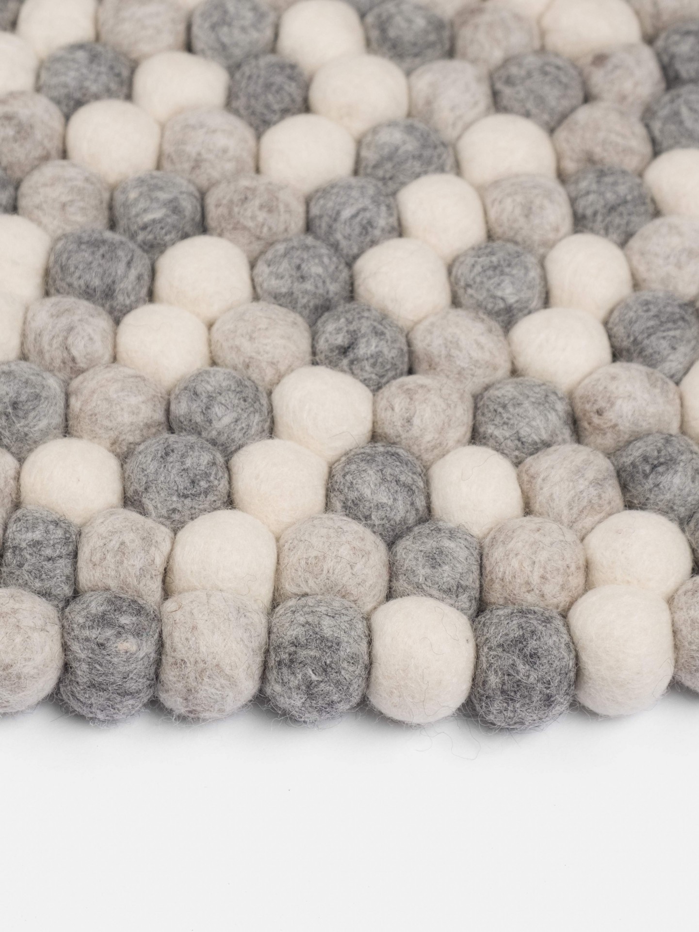 Feito artesanalmente no Nepal, este tapete é um produto puramente natural, quer pelos materiais usados como pelo processo de produção. O feltro de alta qualidade é proveniente de lã virgem da Nova Zelândia, sustentável e eco-friendly, e recebe a sua cor final através de métodos de tingimento ecológicos e sem uso de aditivos químicos. As bolas de feltro são enroladas manualmente, num processo desenvolvido exclusivamente pela marca; são depois costuradas uma a uma, resultando num tapete durável e duradouro. Cada tapete tem um número de série exclusivo.