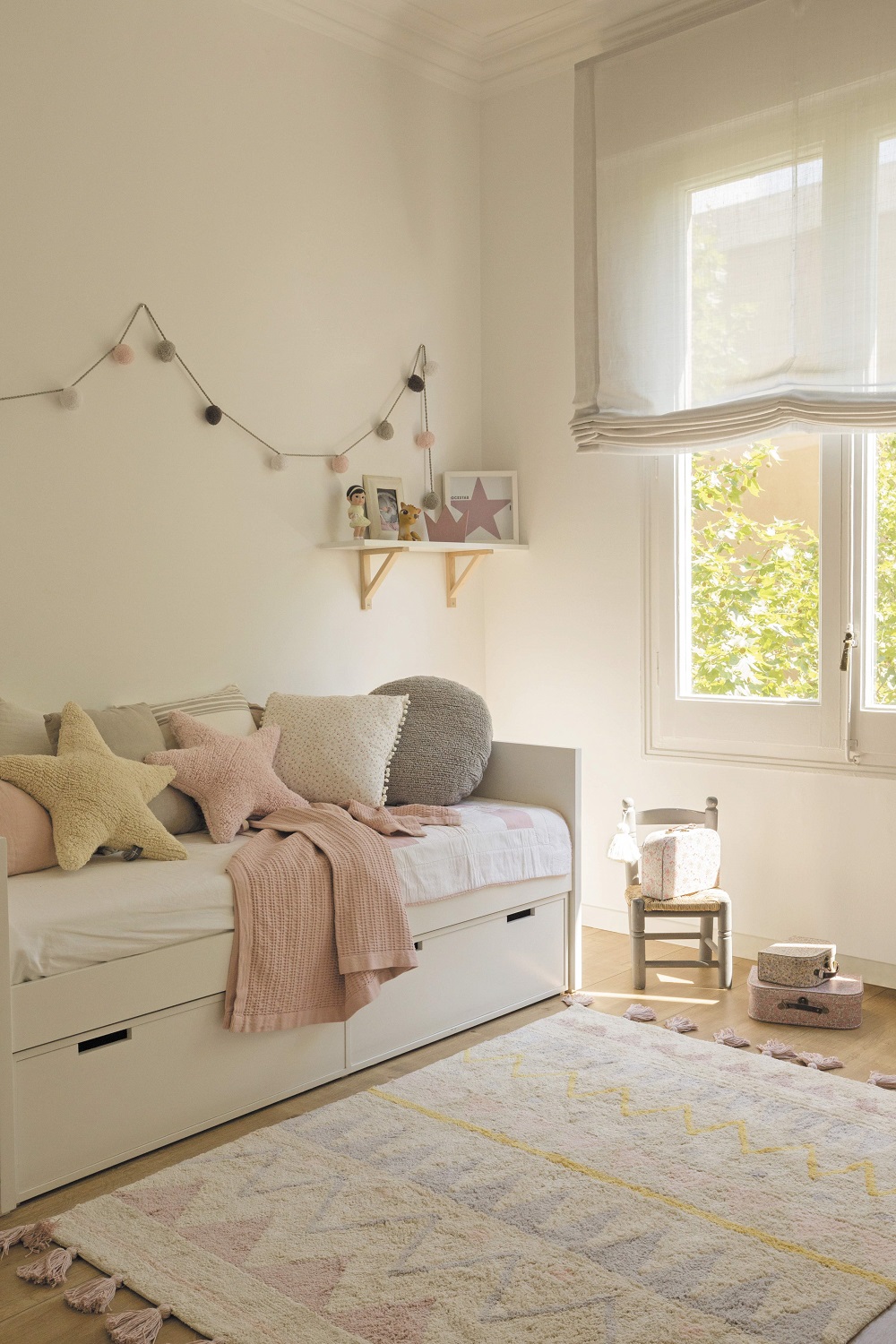 Os motivos étnicos e os pompons nos dois lados do tapete conferem-lhe um estilo único e original, com muita personalidade, que ajudará a criar um ambiente contemporâneo e casual. Graças aos seus tons pastel, é perfeito para quartos de crianças! É também uma ótima escolha para salas.