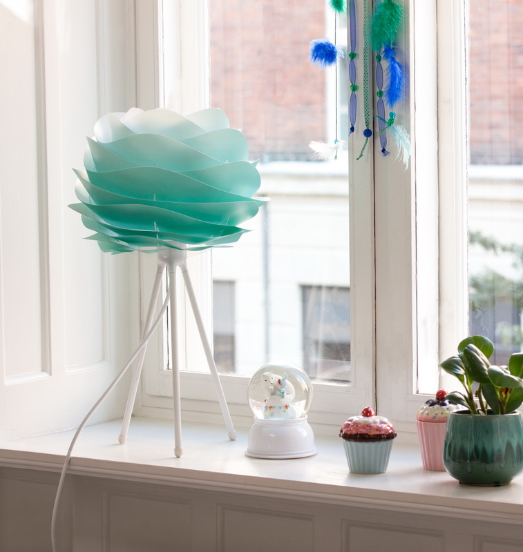 • Abajur verde transparente, globo de neve branco e vasos pequenos numa janela branca