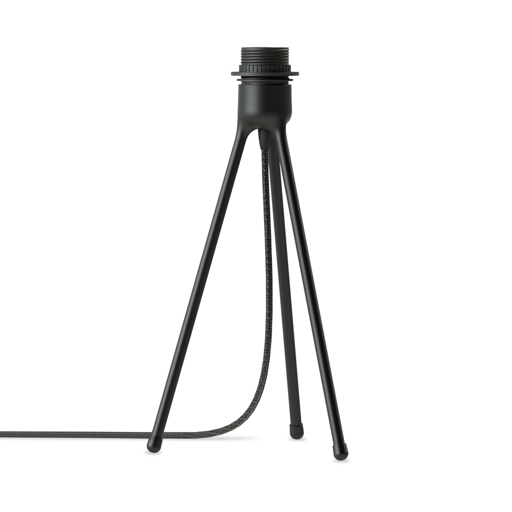 • Base de candeeiro tipo tripé preto com soquete para lâmpada e cabo elétrico